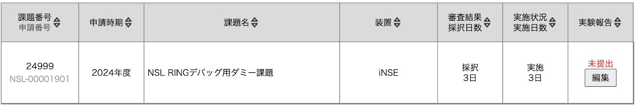 実施課題がリスト表示されるとともに、実験報告書の提出が必要な課題(1日以上実施した課題)の【実験報告】カラムにステータスが未提出と表示