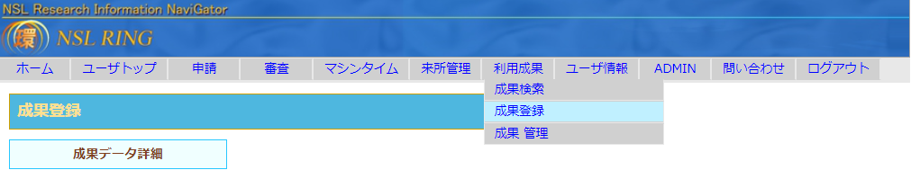 2.メニューの「利用成果」>「成果登録」をクリック